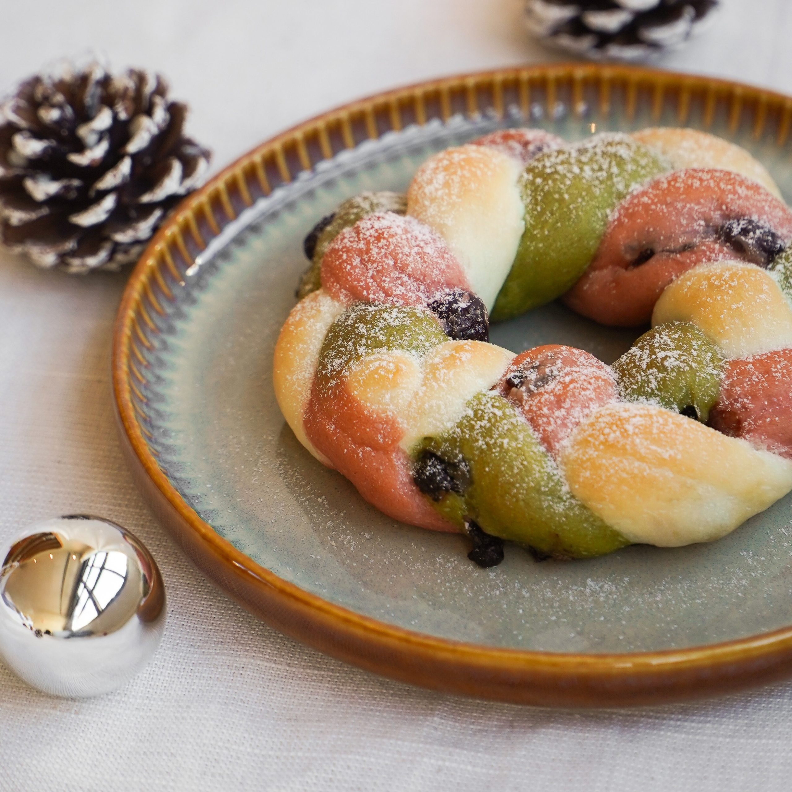 使用山茶花麵粉、包種茶粉和甜菜根粉製作出繽紛色彩的麵包體,內餡裹入蔓越莓乾、葡萄乾,以及苦甜巧克力,豐富了口感和層次。