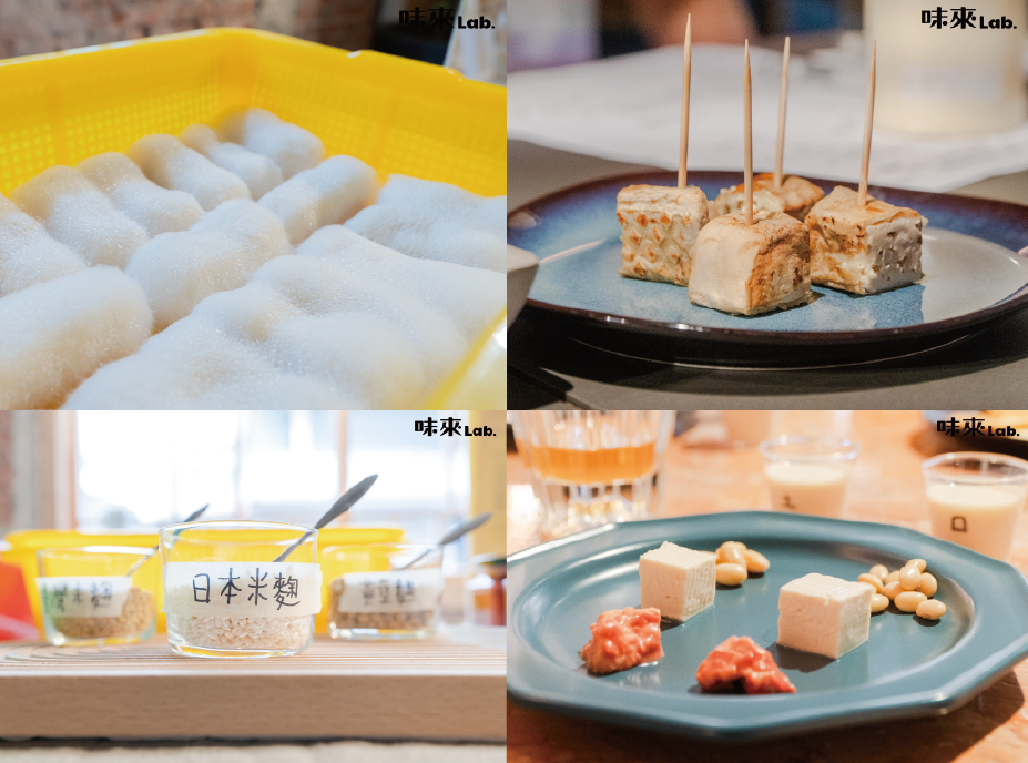 【味來實驗室】更以「原料產地」思考「使用台灣本土食材」的可能性。分別將「本土黃豆v.s.進口黃豆」以煮熟的黃豆、豆漿、豆腐及 蔡仁崇 製作的豆腐乳,四種黃豆及其製品來品嚐感受差異!